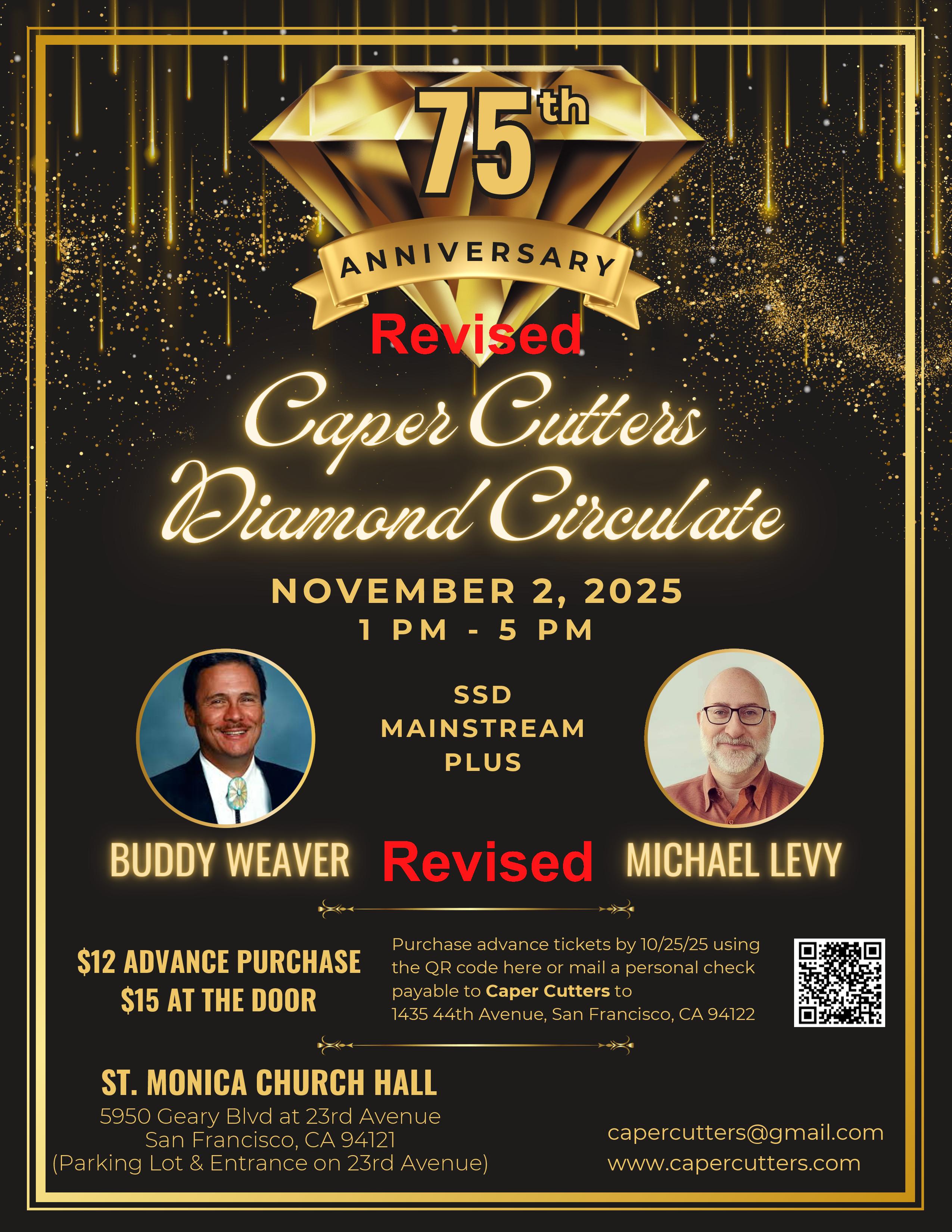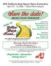 Holiday Magic - September 27th, 2025 - Vacaville, CA 66th Annual Jubilee - October 3rd - 5th, 2025 - San Jose, CA 63rd Anniversary Hoedown - October 18th, 2025 - Martinez, CA Trail's End Dance 2025 At Harvest Hoedown - October 23rd, 2025 - Yuba City, CA 64th Annual Harvest Hoedown - October 24th, 25th, 26th, 2025 - Yuba City, CA Farmers and Farmerettes 64th Anniversary Hoedown - November 1st, 2025 - Newark, CA 75th Anniversary Caper Cutters Diamond Circulate - November 2nd, 2025 - San Francisco, CA Bakersfield Square Dance Roundup - November 7th & 8th, 2025 - Bakersfield, CA Benefit Hoedown W/The Ghost Riders - November 22nd, 2025 - Fremont, CA Anniversary Dance - January 04th, 2026 - Martinez, CA Black and White Ball - January 24th, 2026 - Martinez, CA Beach Bash 805 - January 24th, 2026 - Pismo Beach, CA Fiesta 2026 - March 27th, 28th, 29th, 2026 - San Diego, CA 64th California State Square Dance Convention - April 10th - 12th, 2026 - Santa Maria, CA Silver State Square and Round Dance Festival Trail's End Dance - May 7th, 2026 - Reno, NV Silver State Square and Round Dance Festival - May 8th, 9th,10th, 2026 - Reno, NV GSRU Trail's End Dance - May 21st, 2026 - Lodi, CA Golden State Round Up Caller's Seminar - May 22nd, 2026 - Lodi, CA 73rd Annual Golden State Roundup - May 22nd, 23rd, & 24th, 2026 - Lodi, CA 75th National Square Dance Convention - June 24th - 27th, 2026 - Waco, TX Circle 8 in the Beehive State USA WEST - August 5th - 8th, 2026 - Cedar City, UT 76th National Square Dance Convention - June 23rd - 26th, 2027 - Loveland, CO 77th National Square Dance Convention - June 28th - July 1st - Daytona Beach, FL