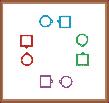 Starting with your partner, join right hands and pull by. Continue around the ring, alternating right and left hands until you meet the 5th person - the partner you started the movement with.