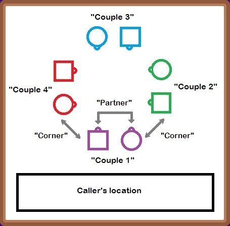 A square is made up of four couples, aligned with the walls of the room. In each couple, the lady stands to the right of the man. Your partner is the person next to you facing the same wall. Your corner is other person next to you - facing a different wall. The couple with their back to the caller is
