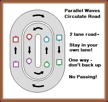 Circulate from parallel Ocean Waves: The paths for this move can be visualized as a 2 lane,two way road running around the square.